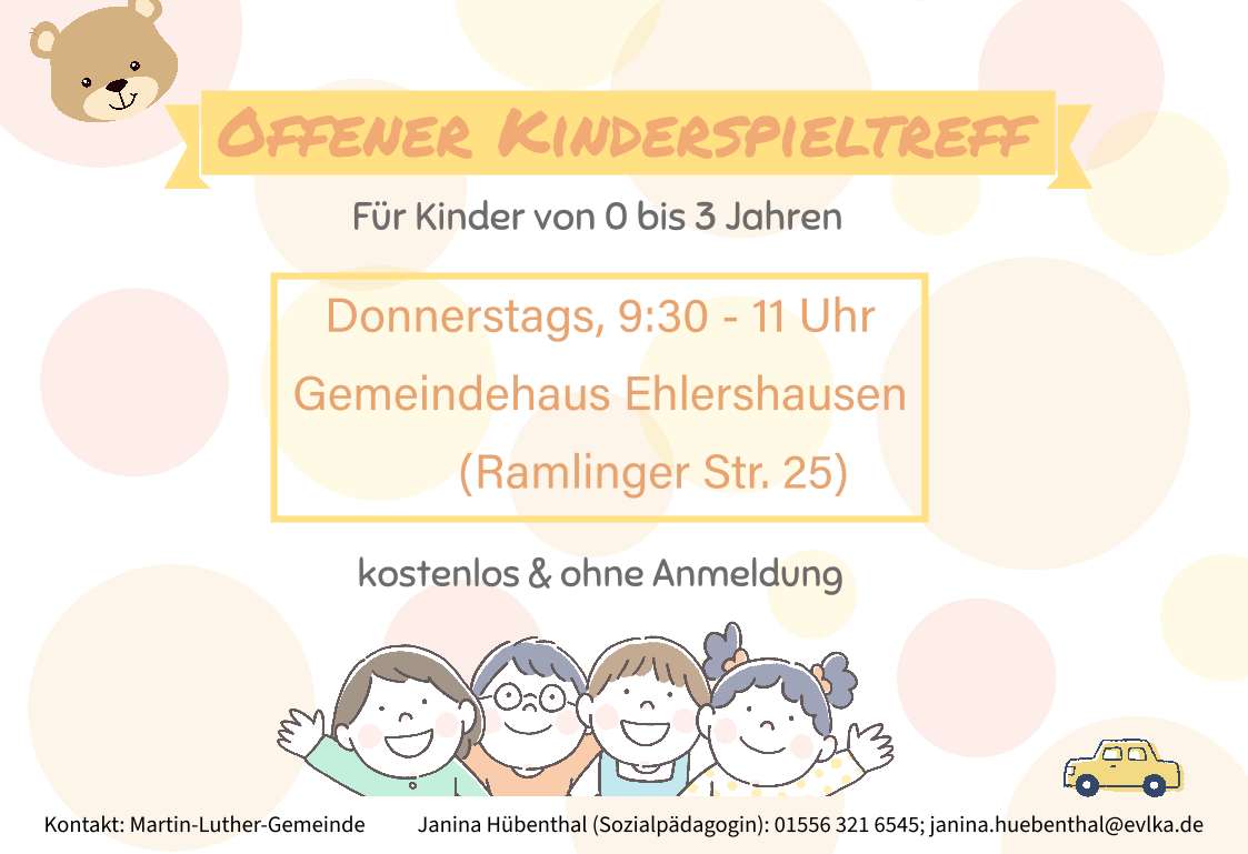 Am 13. Februar geht es los: Ab sofort findet jeden Donnerstag in der Zeit von 9:30 bis 11 Uhr ein offener Spieltreff für Kinder von 0 bis 3 Jahren und ihre Begleitpersonen statt. Wir treffen uns im Jugendraum des Gemeindehauses in Ehlershausen.