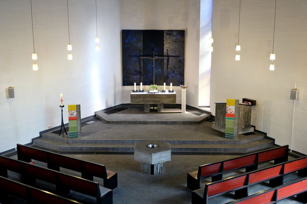 Eingeweiht wurde die Kirche im Jahre 1966 und seither kamen ausgewählte Kunstwerke hinzu. Eine nähere Beschreibung fasst die bau- und kunstgeschichtliche Führung zusammen, die hinter diesem Link hinterlegt ist.